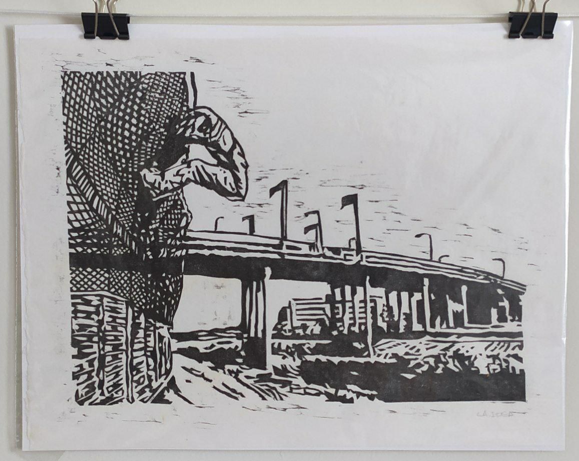 Impressão Xilográfica onde um sujeito pula a cerca que separa os Estados Unidos do restante do continente, uma visão do Rio Bravo e da Ponte que liga o território dividido pela cerca.